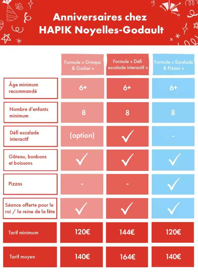 Nous accueillons des groupes de 8 à 15 enfants pour les formules anniversaire. À l’arrivée de votre groupe, les participants sont briefés et équipés. Ils profitent ensuite d’1 heure d’escalade (animée en option par un défi escalade interactif), puis nous vous installons sur votre table réservée pour le goûter. L’équipe Hapik vous aura préparé le gâteau avec les bougies, les bonbons, les boissons et c’est l’heure des cadeaux (avec une séance offerte pour le roi / la reine de la fête de notre part).