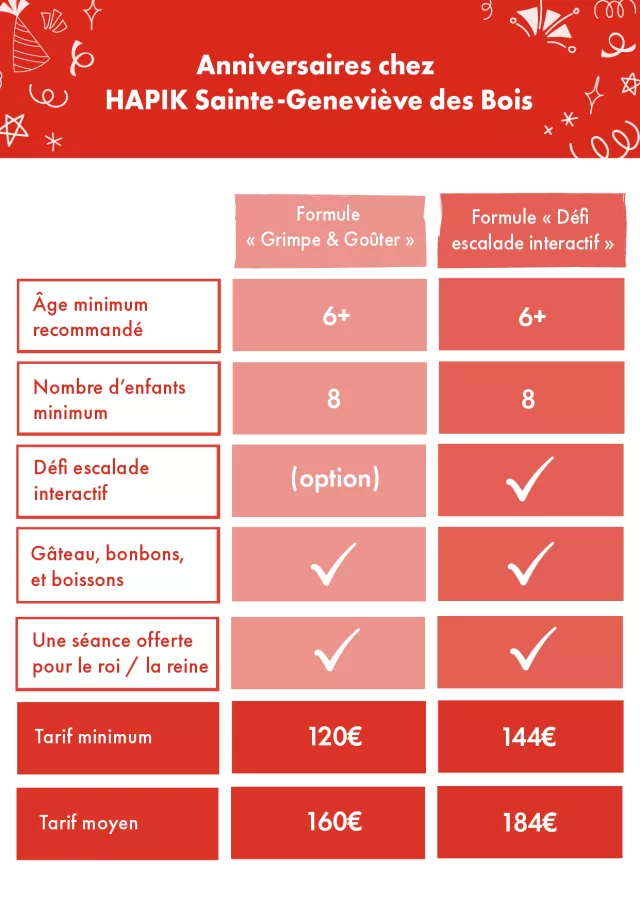 Nous accueillons des groupes de 8 à 15 enfants pour les formules anniversaire. À l’arrivée de votre groupe, les participants sont briefés et équipés. Ils profitent ensuite d’1 heure d’escalade (animée en option par un défi escalade interactif), puis nous vous installons sur votre table réservée pour le goûter. L’équipe Hapik vous aura préparé le gâteau avec les bougies, les bonbons, les boissons et c’est l’heure des cadeaux (avec une séance offerte pour le roi / la reine de la fête de notre part).
